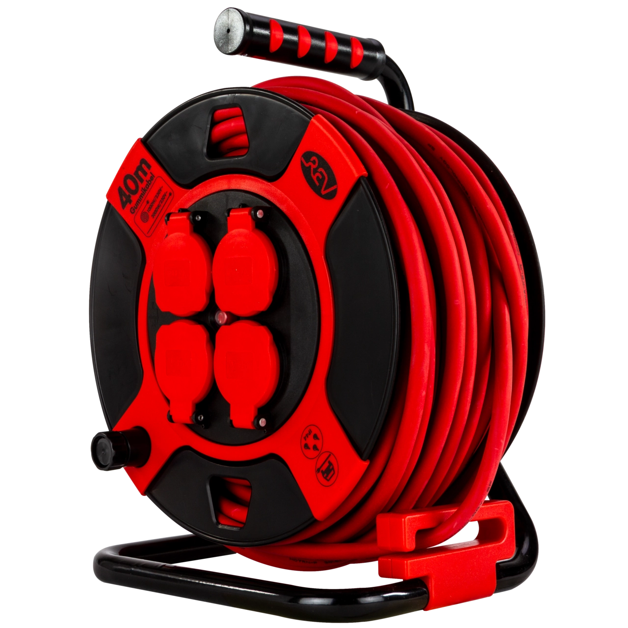 Profi-Kabeltrommel - für eine flexible und sichere Stromverteilung im und rund ums Haus. Die robuste Kabeltrommel bietet einen stabilen, standsicheren Metallständer mit einem federnd gelagertem Trommelkörper aus schlagfestem Spezialkunststoff, wodurch eine langlebige Nutzung gewährleistet wird. Die mobile Stromversorgung lässt sich leichtgängig auf- und abrollen und durch den integrierten Überhitzungsschutz sicher und zuverlässig anwenden. Der mit vielen nutzerfreundlichen Extras ausgestattete Stromverteiler ist für Arbeiten mit mehreren elektrischen Geräten im Innen- und Außenbereich geeignet. Ein großer Arbeitsradius und eine starke Belastung wie z.B. in der Werkstatt oder im Freien auf Baustellen wird durch die schwere und ölbeständige Gummi-Leitung in roter Signalfarbe ermöglicht. Anspruchsvolle Qualität und sorgfältige Verarbeitung - die Kabeltrommel von REV Ritter für den Privat- und Profi-Handwerker.