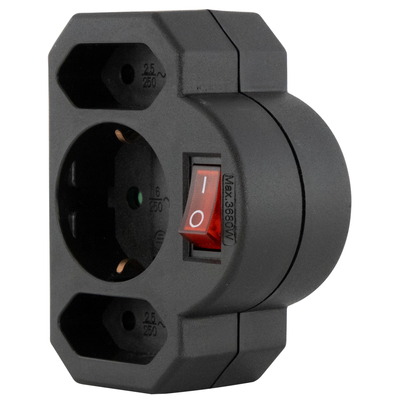 Aus 1 mach 3 - der praktische Steckdosenadapter zum einfachen Erweitern Ihrer Steckdose. Der 3-fach Adapter in sehr kompakter Bauform mit beleuchtetem Schalter, einer Schutzkontakt und zwei Euro-Steckdosen lässt sich einfach in eine übliche Steckdose stecken.