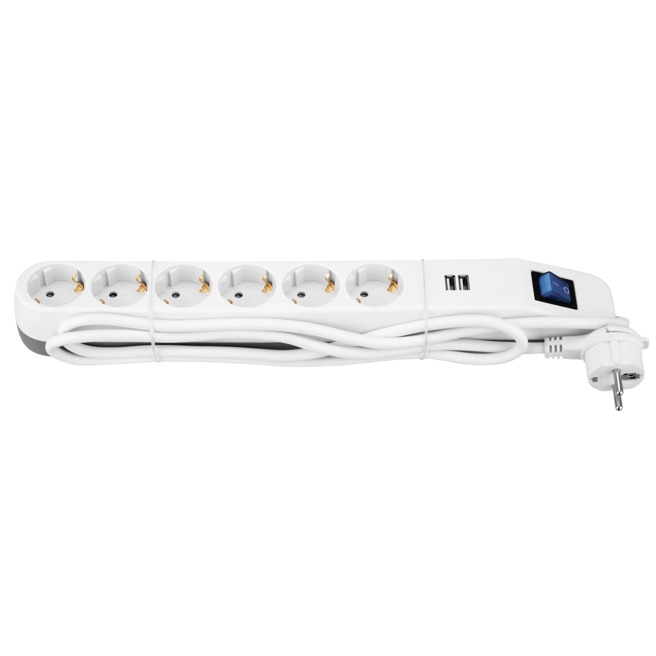 Zweifarbige Mehrfach-Steckdosenleiste ICE mit 6 Schutzkontakt-Steckdosen für eine flexible Stromversorgung von bis zu 6 elektrischen Geräten im Haus oder in der Wohnung. Über die zwei zusätzlichen USB Steckdosen können Sie einfach Ihre elektrischen Geräte wie z.B. Handy, Smartphone, Tablet, Laptop, MP3-Player, Digitalkamera, etc. aufladen. Durch die besondere Bauform mit rückseitiger Kabelführung können Sie das Kabel beidseitig ausführen. Der praktische Flachstecker der Leiste eignet sich auch für die Verwendung hinter Möbeln. Das einfache Herausziehen erfolgt über den ausklappbaren Griff am Stecker. Der flexible Stromverteiler mit 1,4 m Kunststoffleitung bietet ein kompaktes und stabiles Gehäuse aus schlagzähem Kunststoff. Alle Steckdosen sind zur Sicherheit mit einem erhöhten Berührungsschutz ausgestattet und eignen sich durch die quersitzende Bauform auch für elektrische Geräte mit Winkelstecker. Über den integrierten, zweipoligen Ein-/Ausschalter können Sie die angeschlossenen Verbraucher sicher vom Netz trennen. Bei Bedarf kann die Mehrfach-Steckdose über die verdeckten Befestigungsösen auf der Rückseite angeschraubt werden.