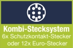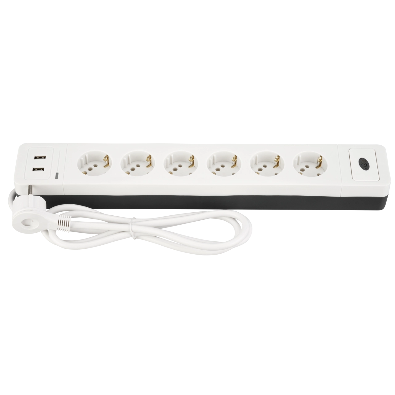 Zweifarbige Mehrfach-Steckdosenleiste Combini mit Kombi-Stecksystem für 6 Schutzkontakt- oder 12 Euro-Stecker. Für eine flexible Stromversorgung von bis zu 12 elektrischen Geräten im Haus oder in der Wohnung. Über die zwei zusätzlichen USB Steckdosen können Sie einfach Ihre elektrischen Geräte wie z.B. Handy, Smartphone, Tablet, Laptop, MP3-Player, Digitalkamera, etc. aufladen. Eine sichere und zuverlässige Verwendung Ihrer eingesteckten Geräte wird durch den integrierten Überspannungsschutz gewährleistet. Dieser schützt Ihre eingesteckten Geräte vor Überspannungen aus dem Stromnetz (Blitz und Überspannungen), ideal für z.B. HiFi- & TV-Geräte, Küchengeräte, Spielekonsolen, Ladegeräte, Tisch- und Stehlampen, Lichterketten, etc. Durch die besondere Bauform mit rückseitigem Kabelführung können Sie das Kabel beidseitig ausführen. Der praktische Flachstecker der Leiste eignet sich auch für die Verwendung hinter Möbeln. Das einfache Herausziehen erfolgt über den ausklappbaren Griff am Stecker. Der flexible Stromverteiler mit 1,4 m Kunststoffleitung bietet ein kompaktes und stabiles Gehäuse aus schlagzähem Kunststoff. Alle Steckdosen sind zur Sicherheit mit einem erhöhten Berührungsschutz ausgestattet und eignen sich durch die quersitzende Bauform auch für elektrische Geräte mit Winkelstecker. Über den integrierten, zweipoligen Ein-/Ausschalter können Sie die angeschlossenen Verbraucher sicher vom Netz trennen. Bei Bedarf kann die Mehrfach-Steckdose über die verdeckten Befestigungsösen auf der Rückseite angeschraubt werden.