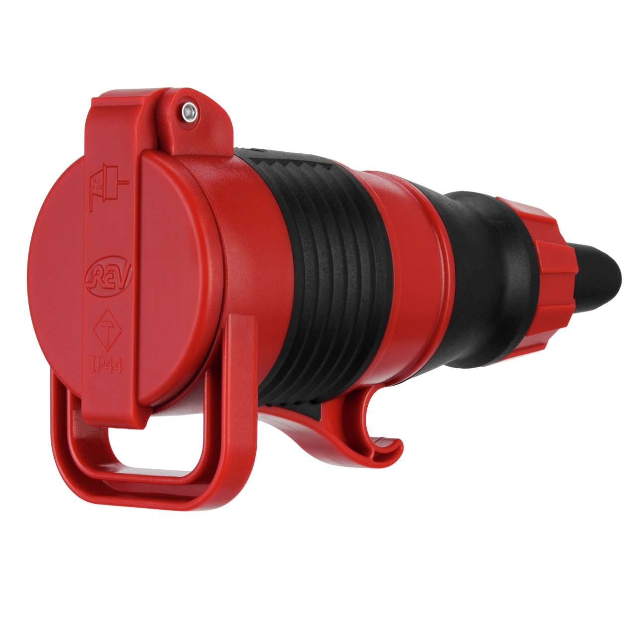 Wiederanschließbare, robuste Gummi-Schutzkontakt-Kupplung mit Deckel zentraler Kabeleinführung für die einfache Nachrüstung, Austausch oder Ersatz. Die Kupplung bietet ein schlag- und stoßfestes Gehäuse aus witterungsbeständigem Polycarbonat und Gummi, geeignet für die Anwendung im Innen- und Außenbereich.