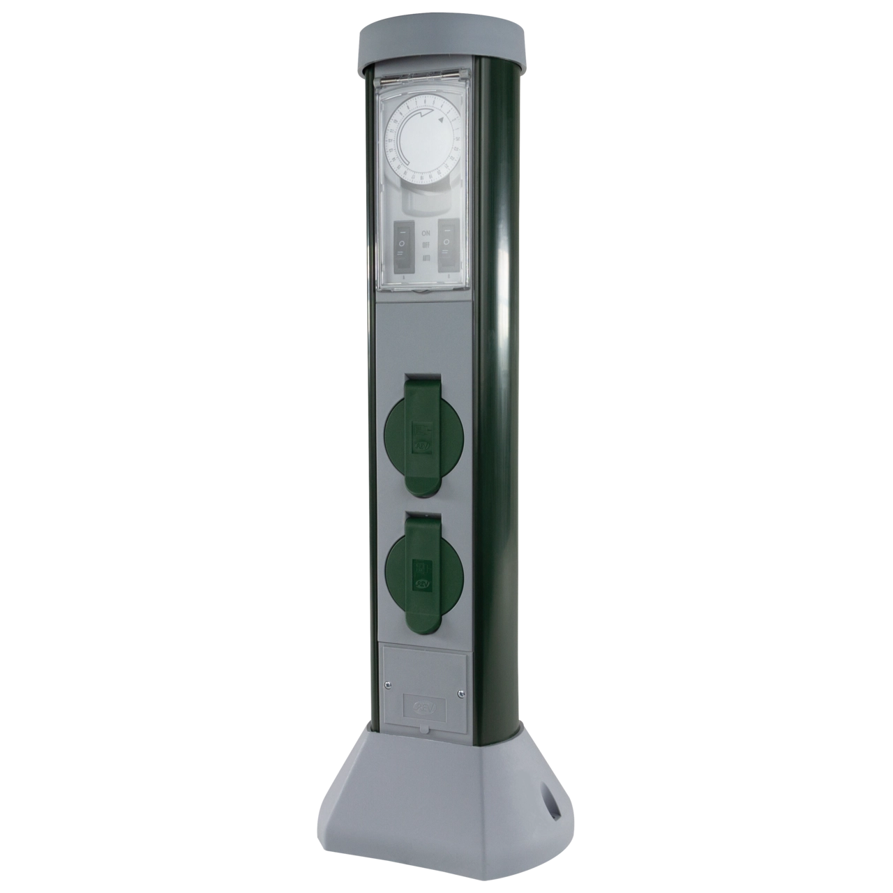 Die Gartensteckdose Greencraft ist ein praktischer Stromverteiler für Ihren Garten und Terrasse. Konzeptionell für den dauerhaften Einsatz im Außenbereich entwickelt, ist die Außensteckdose Spritzwasser geschützt (IP44) und hat ein sehr robustes und witterungsbeständiges Gehäuse aus Spezialkunststoff. Strom im Garten - dort wo Sie ihn benötigen - zum Rasen mähen, Hecken schneiden oder zum Anschluss Ihrer Beleuchtung wie z.B. Gartenlampen, Weihnachtsbeleuchtung, Lichterketten, Elektrogrill und viele mehr. Über die integrierte Zeitschaltuhr können Sie eine zeitliche, automatische Steuerung für die angeschlossenen Geräte einstellen. Die verschiedenen Befestigungsmöglichkeiten garantieren einen festen Halt auf nahezu jedem Untergrund. Sei es durch Anschrauben am Sockel z.B. auf der Holzterrasse, einfaches Einstecken mittels des mitgelieferten Erdspießes z.B. im Beet oder Rasen oder dem Befestigen mit Einschlaghülse z.B. in weichem Untergrund. Auch beim Anschluss haben Sie verschiedene Möglichkeiten, einfach den Stecker der vormontierten, 5 m langen Gummileitung in eine übliche Steckdose stecken oder zur Festinstallation an ein vorhandenes Erdkabel anschließen. Entsprechende Leitungseinführungen für Erdkabel bis 3 x 2, 5 mm² und ein extra groß gehaltener Anschlussraum sind vorhanden. Bei den Steckdosen handelt es sich um zwei spritzwassergeschützte Schutzkontaktsteckdosen IP44 mit Klappdeckel.