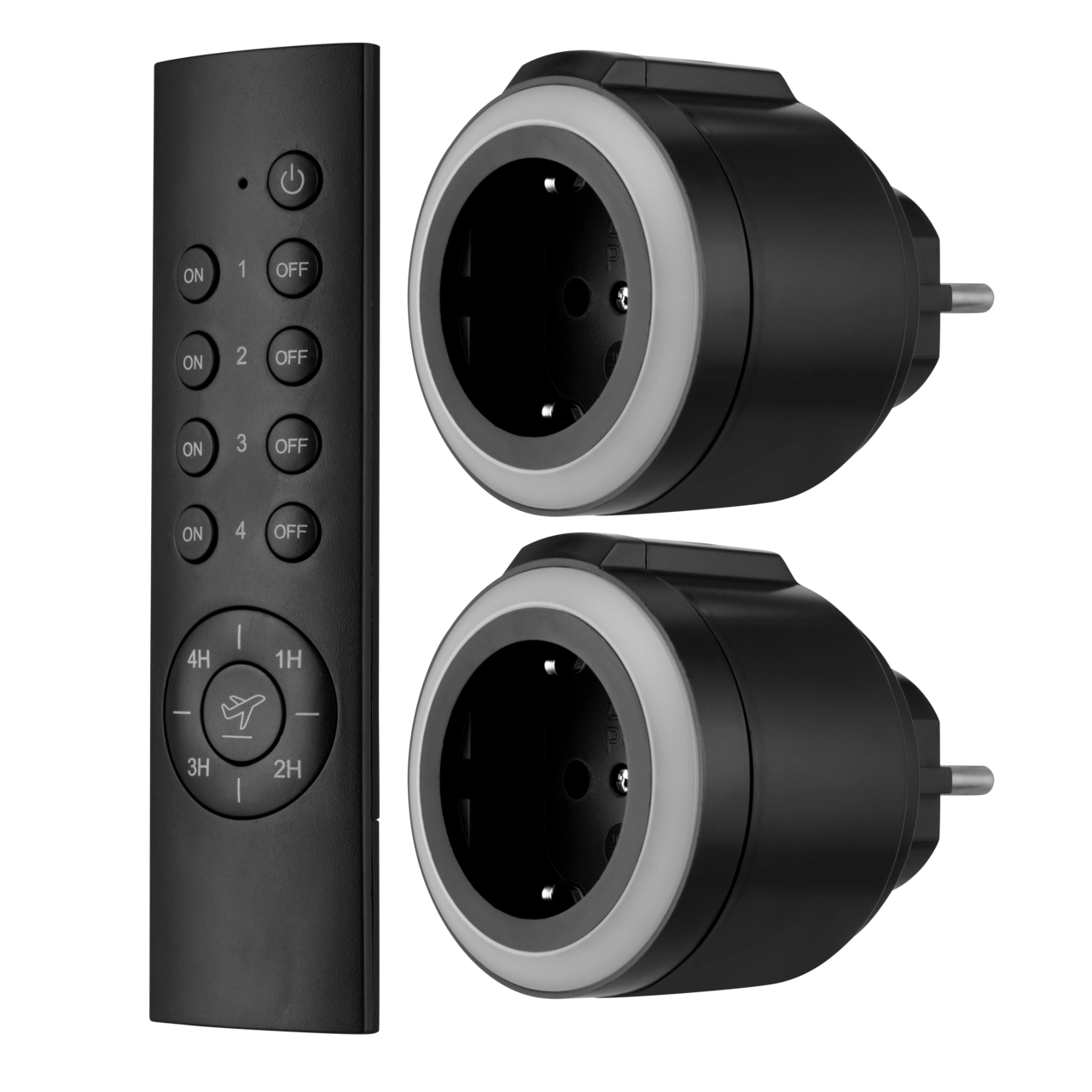 Das praktische Funkschalt-Set Comfort zum einfachen und komfortablen Schalten Ihrer elektrischen Geräte und Beleuchtung per Funk-Fernbedienung. Ideal für das bequeme Steuern im Haus und Wohnung für z.B. Tisch- und Stehlampen, Deko-Beleuchtung, Lichterketten, Computer, TV, Spielekonsolen, Ventilatoren, Klimageräte, etc. Das flexible Set mit 1 Fernbedienung und 2 Steckdosen punktet durch die schnelle und kinderleichte Handhabung. Einfach Schaltsteckdose in eine übliche Steckdose stecken, Taste Ein/Aus der Steckdose 5 Sekunden drücken, auf der Fernbedienung die ON Taste des gewünschten Kanals 1 bis 4 drücken und den Stecker Ihres elektrischen Gerätes einstecken - fertig. Mit der 4-Kanal-Fernbedienung können Sie bis zu vier Geräte getrennt oder über den Hauptschalter gemeinsam schalten. Zusätzlich können Sie bei Bedarf über die Fernbedienung eine Countdown Funktion von 1, 2, 3 oder 4 Stunden auswählen. Nach Ablauf der ausgewählten Zeit wird das eingesteckte Gerät selbstständig ausgeschaltet. Der integrierte LED Leuchtring der Steckdose signalisiert optisch die Schaltfunktion. Auch eine Zufallsfunktion für z.B. eine Anwesenheitssimulation während dem Urlaub können Sie über eine Taste der Fernbedienung einfach auswählen. Sparen Sie Strom und Geld durch Abschalten von Stromfressern wie z.B. elektrische Verbraucher mit Stand-by Funktion. Das Funkschalt-Set bietet Ihnen eine kompakte Bauform, eine hohe Schaltleistung bis 3.680 W und eine Reichweite von 50m (Freifeld). Die Steckdosen sind zur Sicherheit mit einem erhöhten Berührungsschutz ausgestattet. Eine Batterie für die Fernbedienung ist im Lieferumfang enthalten.