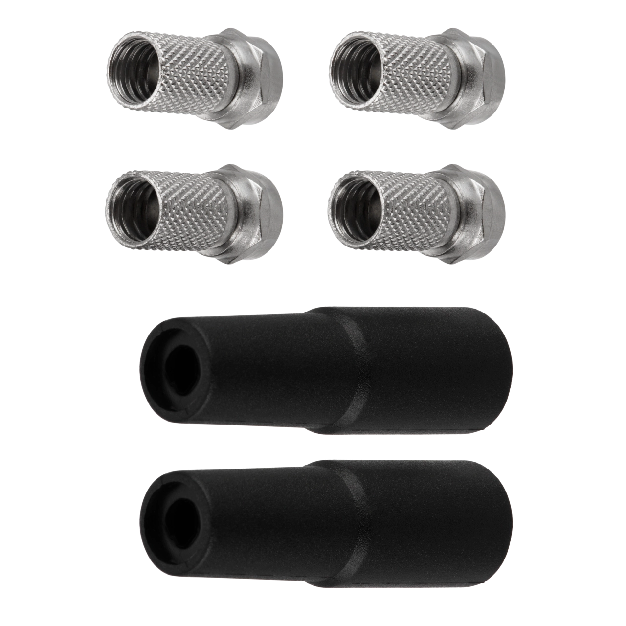 Solide F-Stecker mit Schraubanschluss und 2 Wetterschutztüllen für Antennenkabel (DVB-S - Digitales Satellitenfernsehen). Die Stecker sind aus massivem Metall, geeignet für die Anwendung im Innen- und Außenbereich.