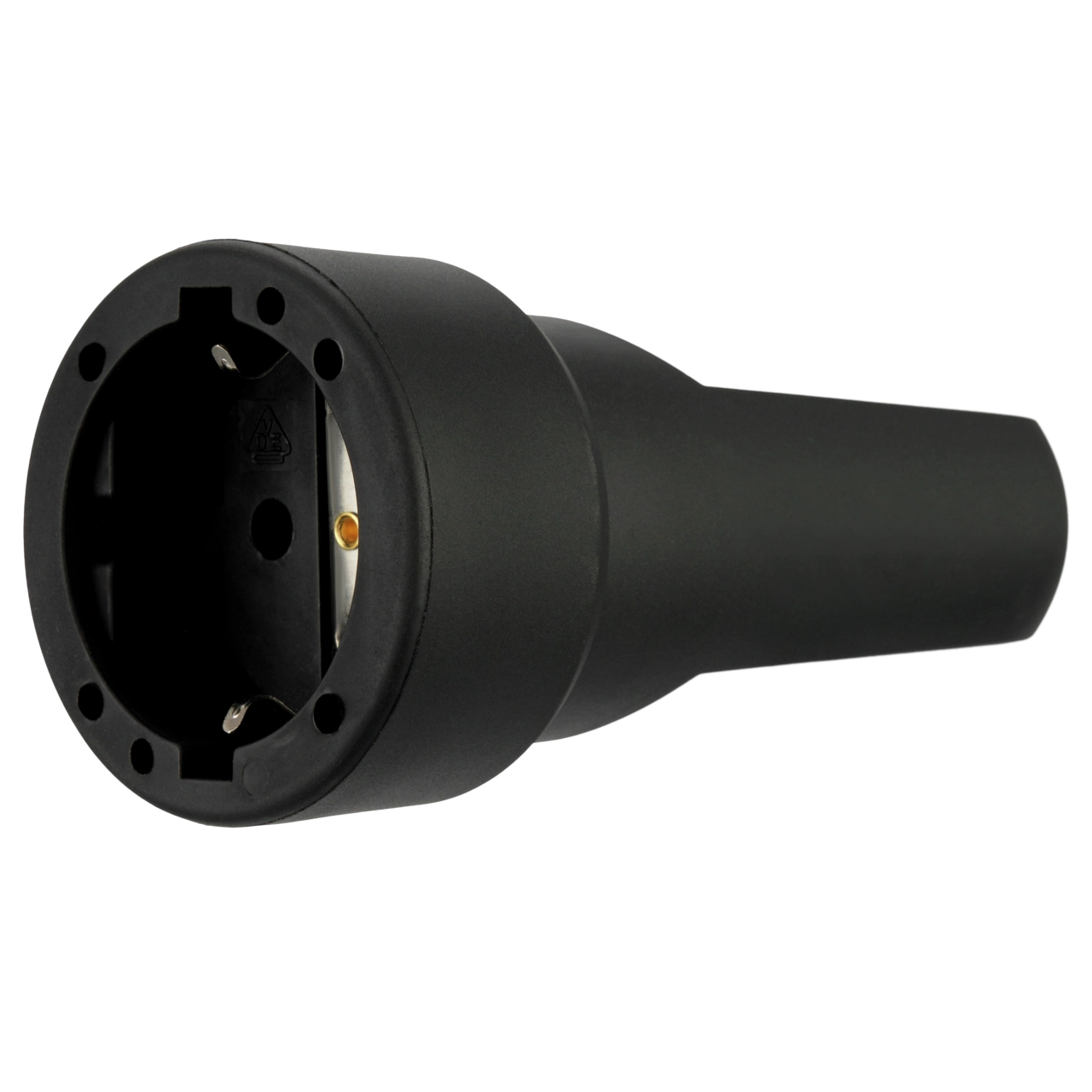 Wiederanschließbare, robuste Vollgummi-Schutzkontakt-Kupplung mit zentraler Kabeleinführung für die einfache Nachrüstung, Austausch oder Ersatz. Die Kupplung bietet ein schlag- und stoßfestes Gehäuse aus witterungsbeständigem Gummi, geeignet für die Anwendung im Innen- und Außenbereich.