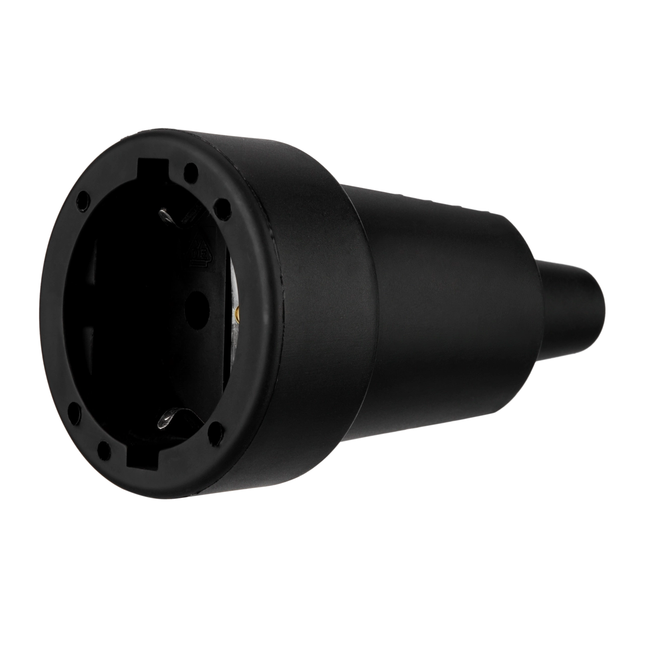 Wiederanschließbare, robuste Gummi-Schutzkontakt-Kupplung mit zentraler Kabeleinführung für die einfache Nachrüstung, Austausch oder Ersatz. Die Kupplung bietet ein schlag- und stoßfestes Gehäuse aus witterungsbeständigem Gummi, geeignet für die Anwendung im Innenbereich.