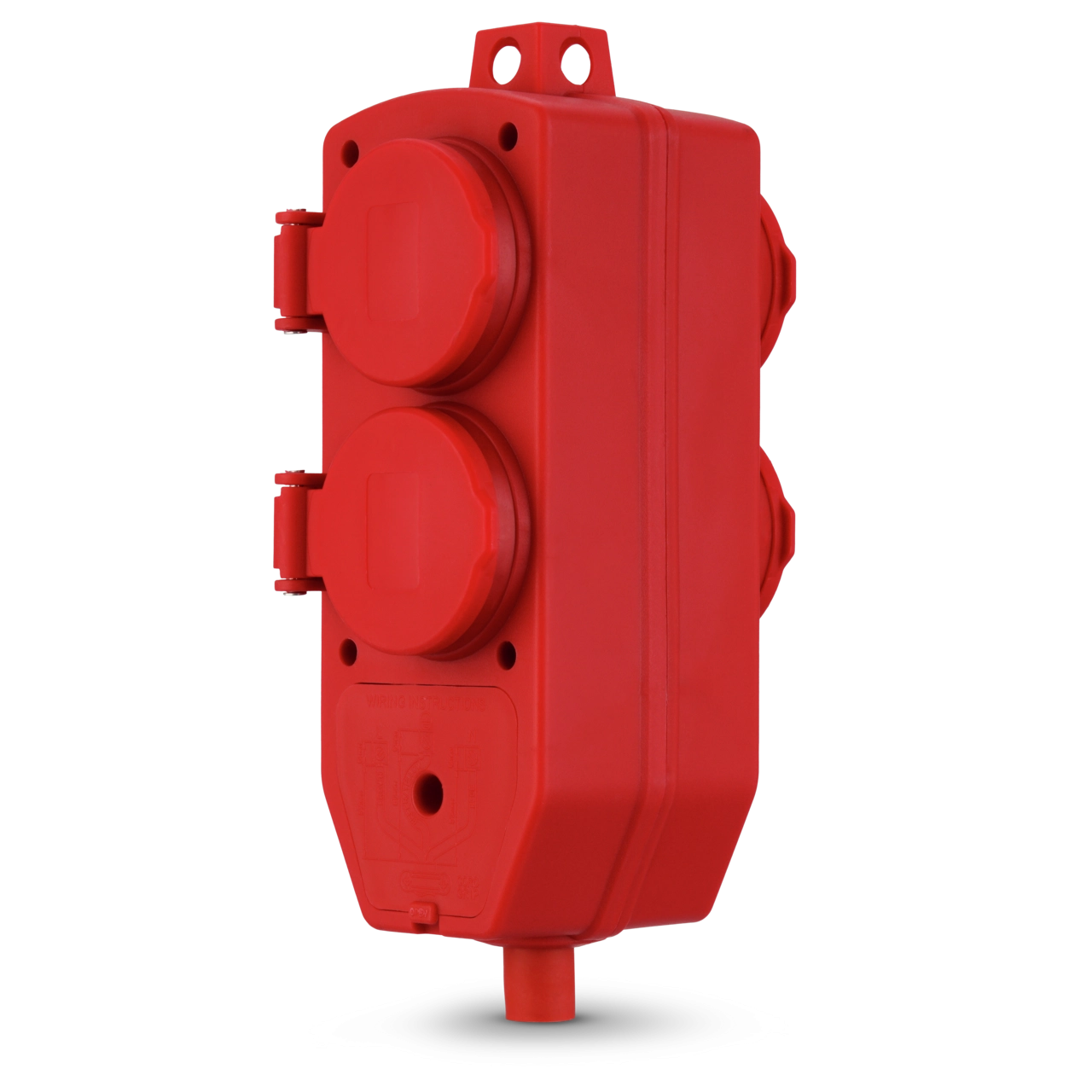 Wiederanschließbare Schutzkontakt-Kupplung 4-fach mit Deckel und zentraler Kabeleinführung für die einfache Nachrüstung, Austausch oder Ersatz. Die Kupplung bietet ein kompaktes und stabiles Gehäuse aus hochwertigem Kunststoff, geeignet für die Anwendung im Innen- und Außenbereich.
