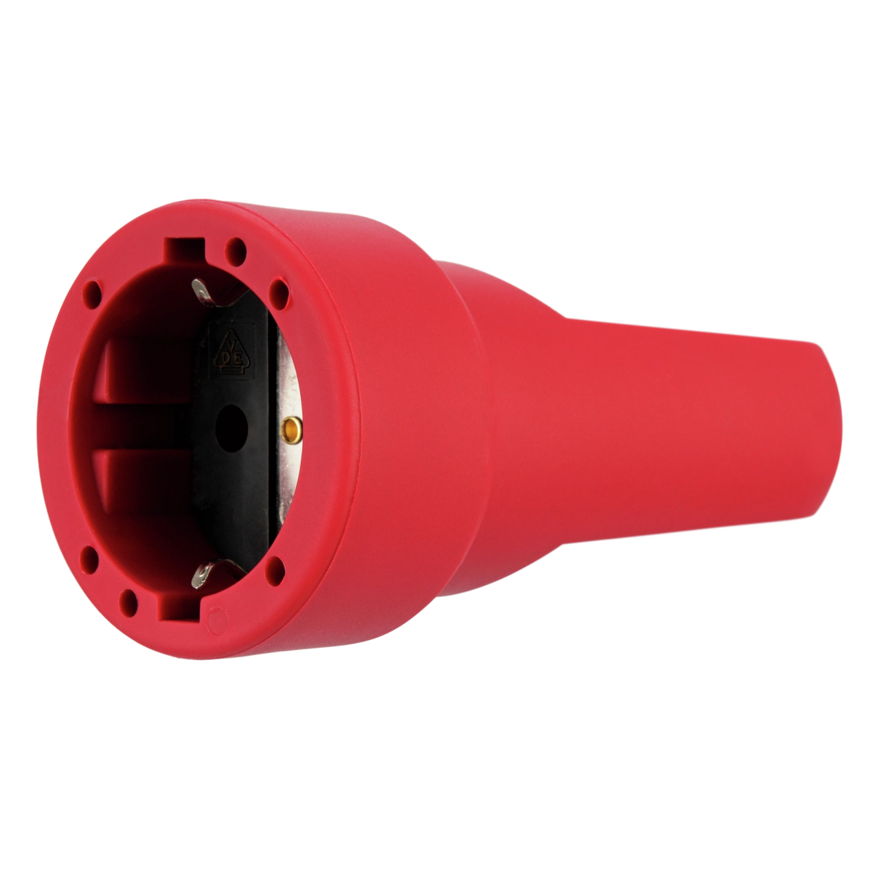 Wiederanschließbare, robuste Vollgummi-Schutzkontakt-Kupplung mit zentraler Kabeleinführung für die einfache Nachrüstung, Austausch oder Ersatz. Die Kupplung bietet ein schlag- und stoßfestes Gehäuse aus witterungsbeständigem Gummi, geeignet für die Anwendung im Innen- und Außenbereich.