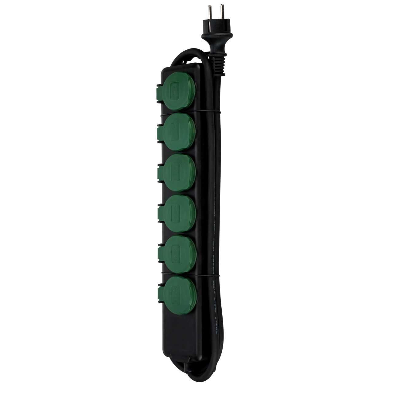 Mehrfach-Steckdosenleiste mit 6 spritzwassergeschützten Schutzkontakt-Steckdosen für eine flexible Stromversorgung von bis zu 6 elektrischen Geräten im Haus oder rund ums Haus. Der flexible Stromverteiler mit 1,4 m Gummileitung bietet ein robustes und witterungsbeständiges Gehäuse aus schlagfestem Kunststoff für innen und außen. Alle Steckdosen sind zur Sicherheit mit einem erhöhten Berührungsschutz und Klappdeckel ausgestattet und eignen sich durch die quersitzende Bauform auch für elektrische Geräte mit Winkelstecker.
