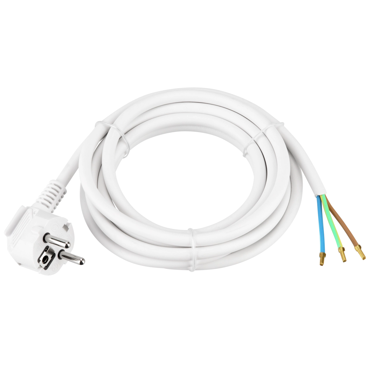 Schutzkontakt-Zuleitung für den elektrischen Anschluss schutzisolierter Elektrogeräte im Haus. Die Verlängerungsleitung bietet eine 3 m lange hochwertige Kunststoff-Leitung mit stabilem Kunststoff-Schutzkontakt-Stecker auf der einen und drei abisolierte Leitungsenden auf der anderen Seite. Zum Anschluss oder Austausch an Elektrogeräten mit einer Belastbarkeit bis 3.680 W.