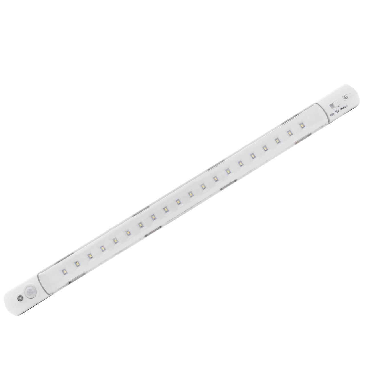 Die kabellose LED Leuchte überzeugt durch Ihre flache Bauform aus bruchfestem Kunststoff, besonders geeignet für Schränke und Regale. Die Leuchte wird mit handelsüblichen Batterien oder Akkubatterien betrieben und sorgt dadurch überall dort für Licht, wo kein Strom verfügbar ist. Die mobile Lichtleiste ohne Kabel ist universell einsetzbar und somit das ideale Gerät für Haushalt, Hobby und Camping. Mit dem eingebauten Schalter lässt sich die gewünschte Betriebsart - Ein / Aus oder Automatik (Bewegungsmelder) auswählen. Über den integrierten Bewegungsmelder kann das Licht automatisch bei Bewegung geschaltet werden. Die energieeffiziente LED-Technologie der Leuchte bietet eine nachhaltige und lange Lebensdauer. Sie hat eine effektive Leuchtkraft in einem tageslichtweißen Licht, womit eine optimale Ausleuchtung erreicht wird.